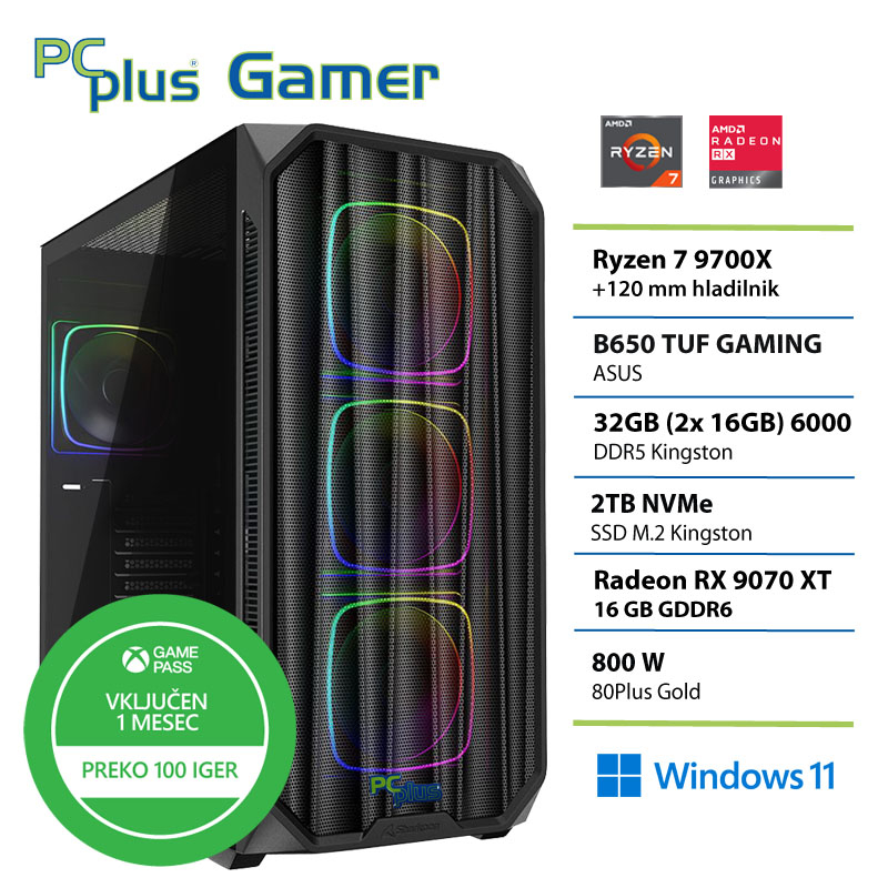PCPLUS Gamer Ryzen 7 9700X 32GB 2TB NVMe SSD RX 9070 XT 16GB Windows 11 Home gaming namizni računalnik