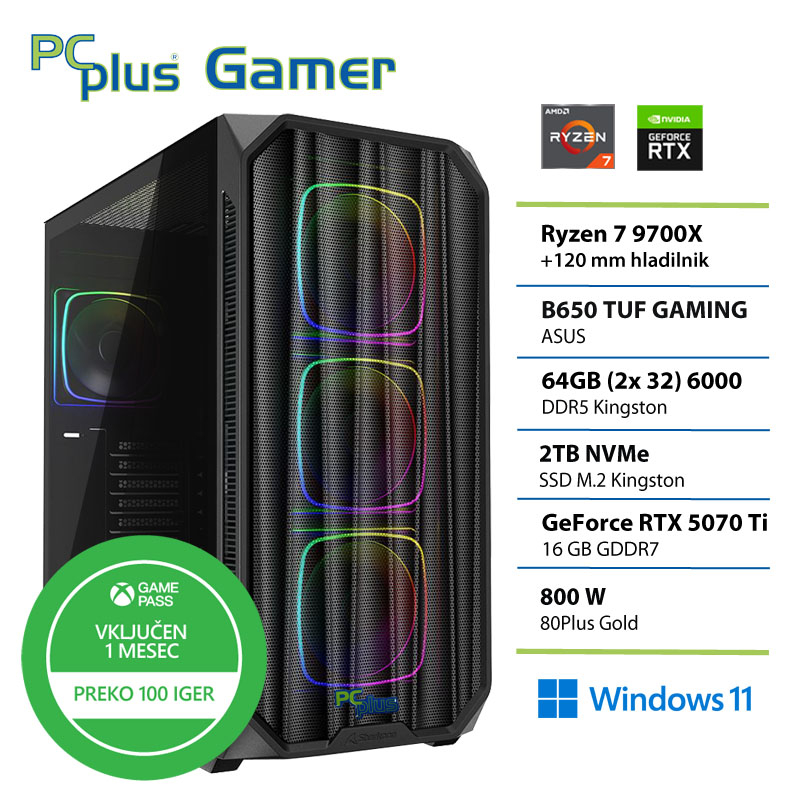 PCPLUS Gamer Ryzen 7 9700X 64GB 2TB SSD RTX 5070Ti 16GB Windows 11 Home + Xbox GP gaming namizni računalnik